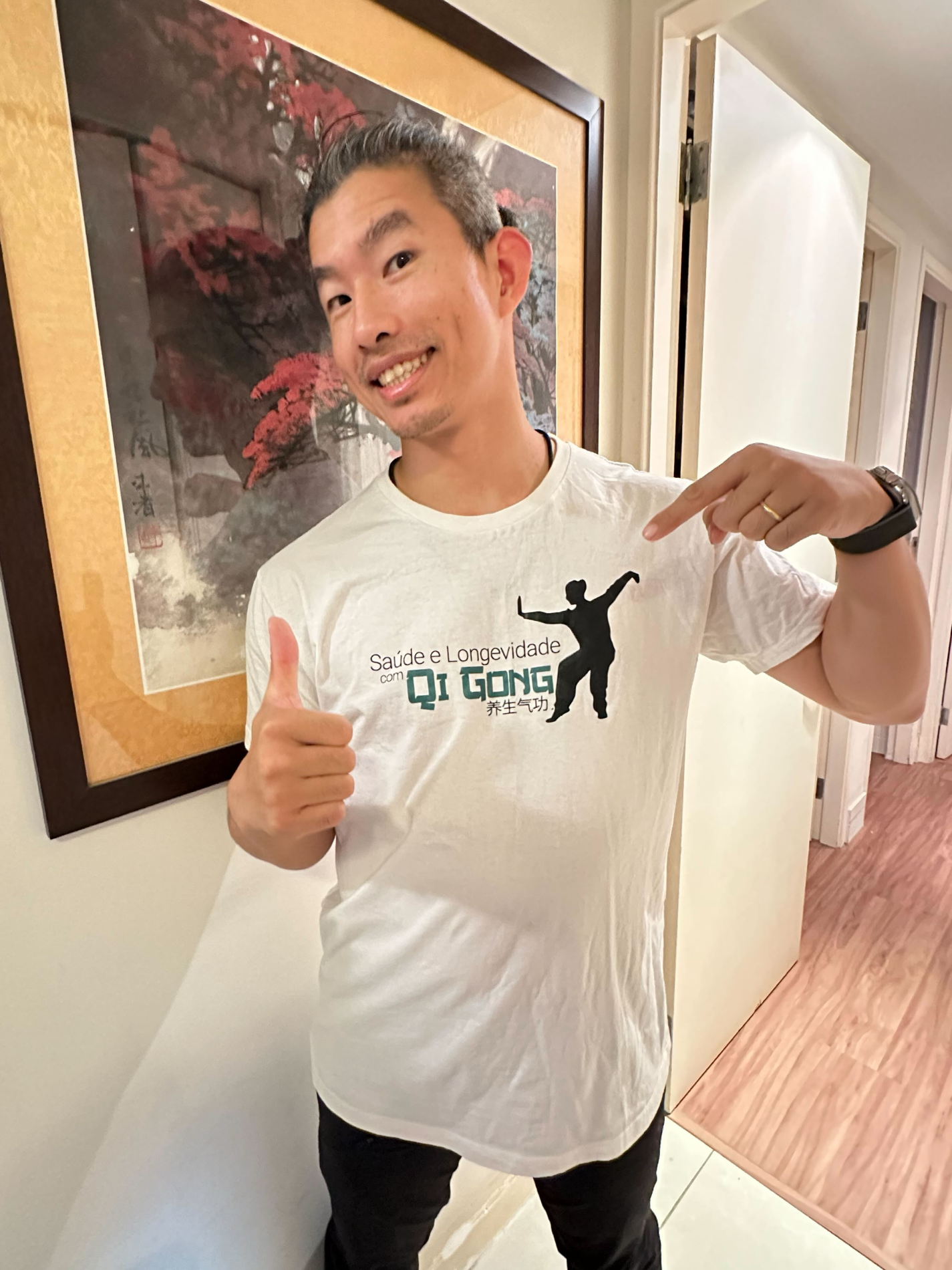 Olha meu Mestre Ye, com a cobiçada camiseta do nosso curso de Qi Gong, o fim das dores na lombar e das insônias online. Meu porojeto de viagem é ir para São Paulo fazer uma aula na academia do mestre. Ele também dá aula de Kung Fu. Mas aí, é só para olhar…