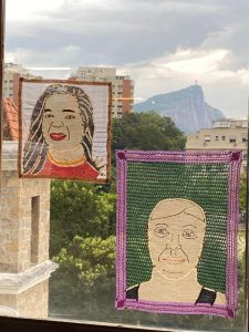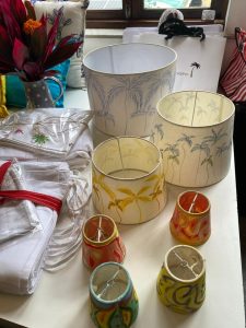 Angela Carvalho: Além das sandálias douradas em parceria com a Isabela Capeto, faz cúpulas em vários tamanhos, almofadas, capas de enredo. Tudo pintado por ela, com caneta francesa. Desde R$ 300