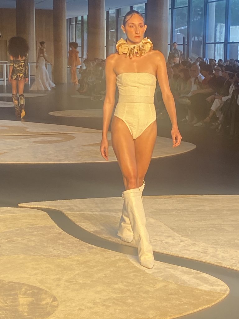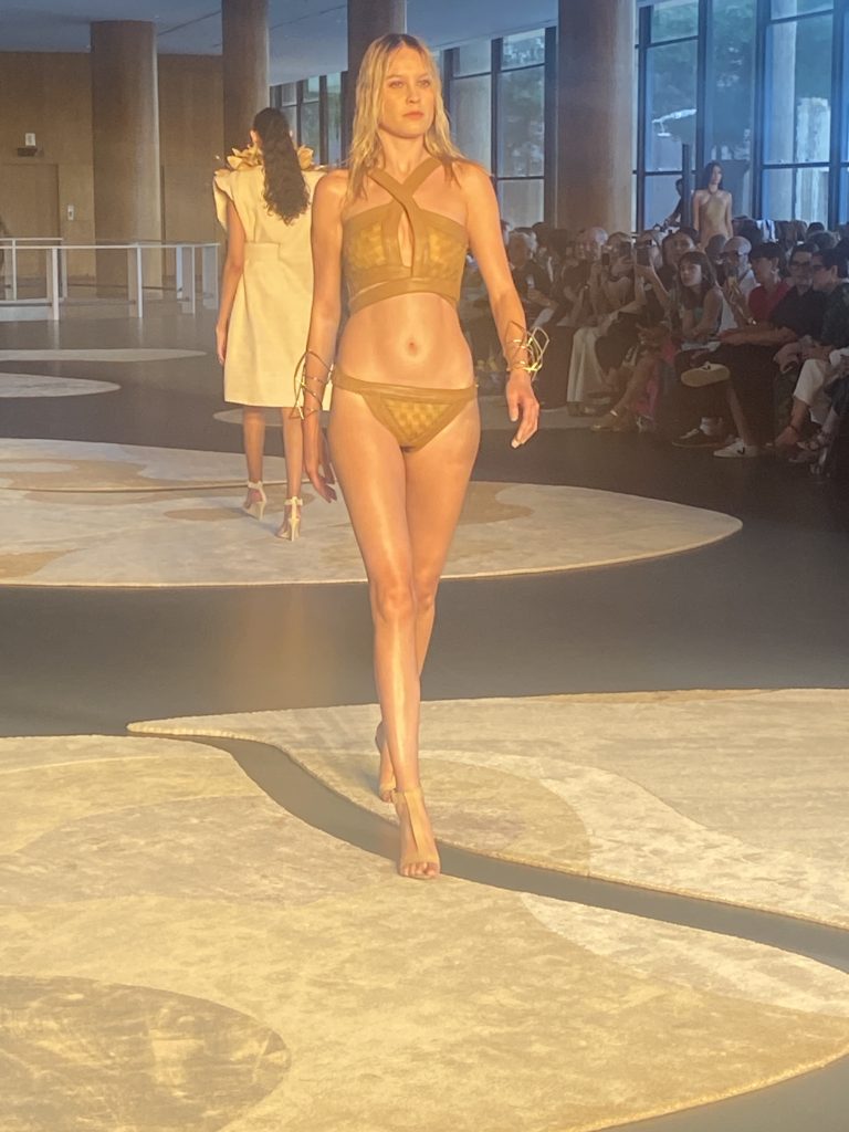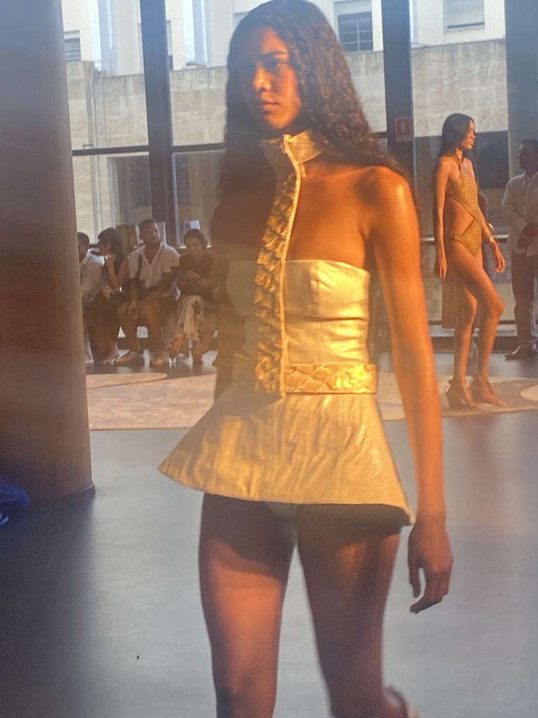 Este museu mineiro inspirou as estampas, as geometrias e o colorido da coleção do verão 2026 da Lenny Niemeyer. Maiôs e biquínis de cortes elegantes desfilaram complementados por capas flutuantes, asas plissadas, flores grandes em um lugar de alça, acessórios inovadores, em latão, sementes e artesanias de várias partes do país.