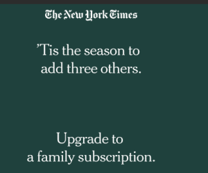Um presente muito especial, para quem lê em inglês: dividir sua assinatura do New York Times com mais 3 pessoas. É jornal online, completo, nos primeiros seis meses por US$ 0,50 por semana (ou US$ 2 por mês). Se as noticias assustarem, vale pelas receitas, o caderno de domingo e…os jogos! Depois de algum treino, a versão Mini de palavras cruzadas fica fácil! O Antonio Bernardo, muito mais sabido, gosta do Wordle!